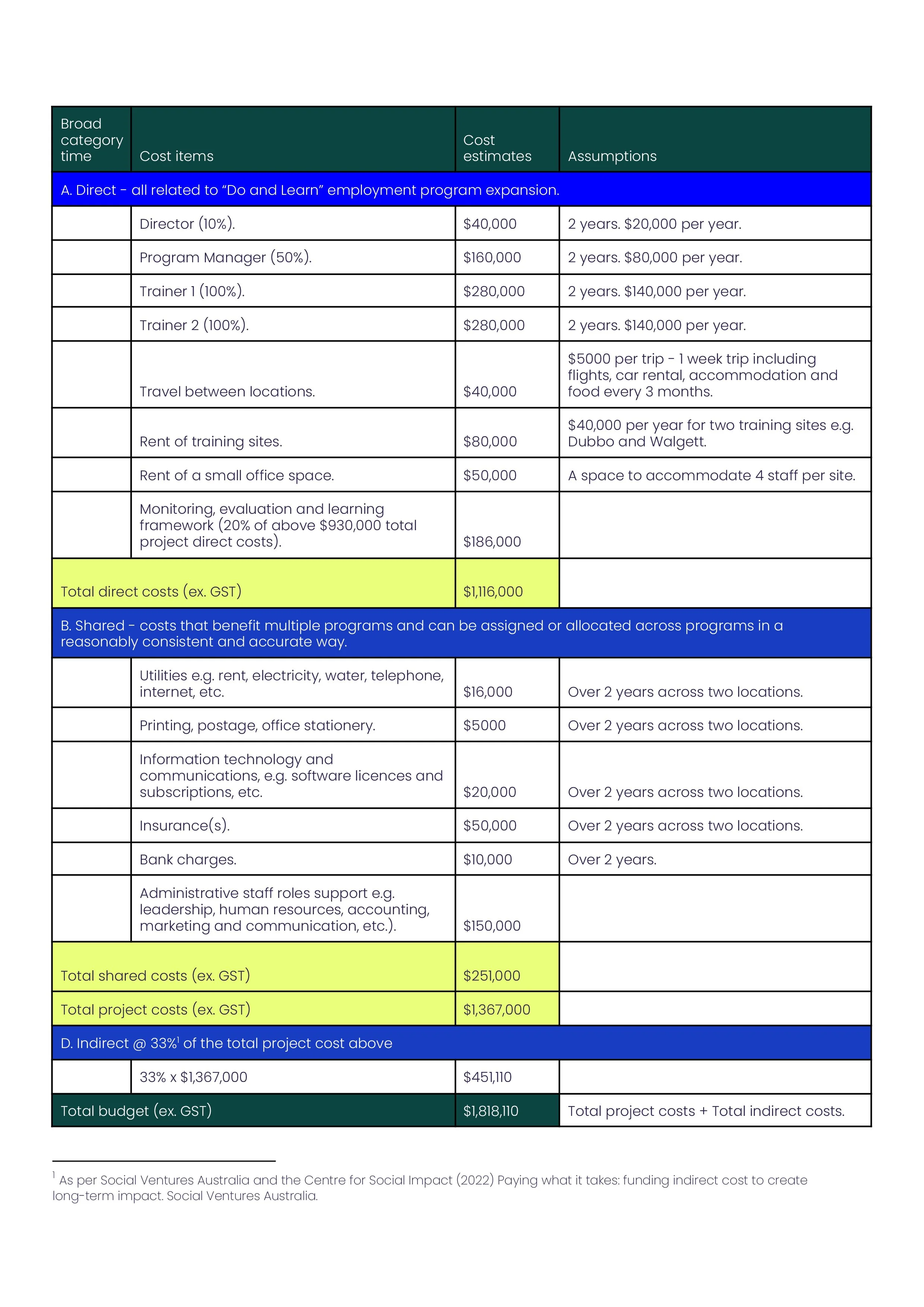Here, indirect costs are calculated at 33%, based on the methodologies outlined in the ‘Paying What It Takes report’. This approach is particularly useful for smaller organisations seeking to understand their operational costs. The percentage reflects considerations of organisational size, context, and operational model.
