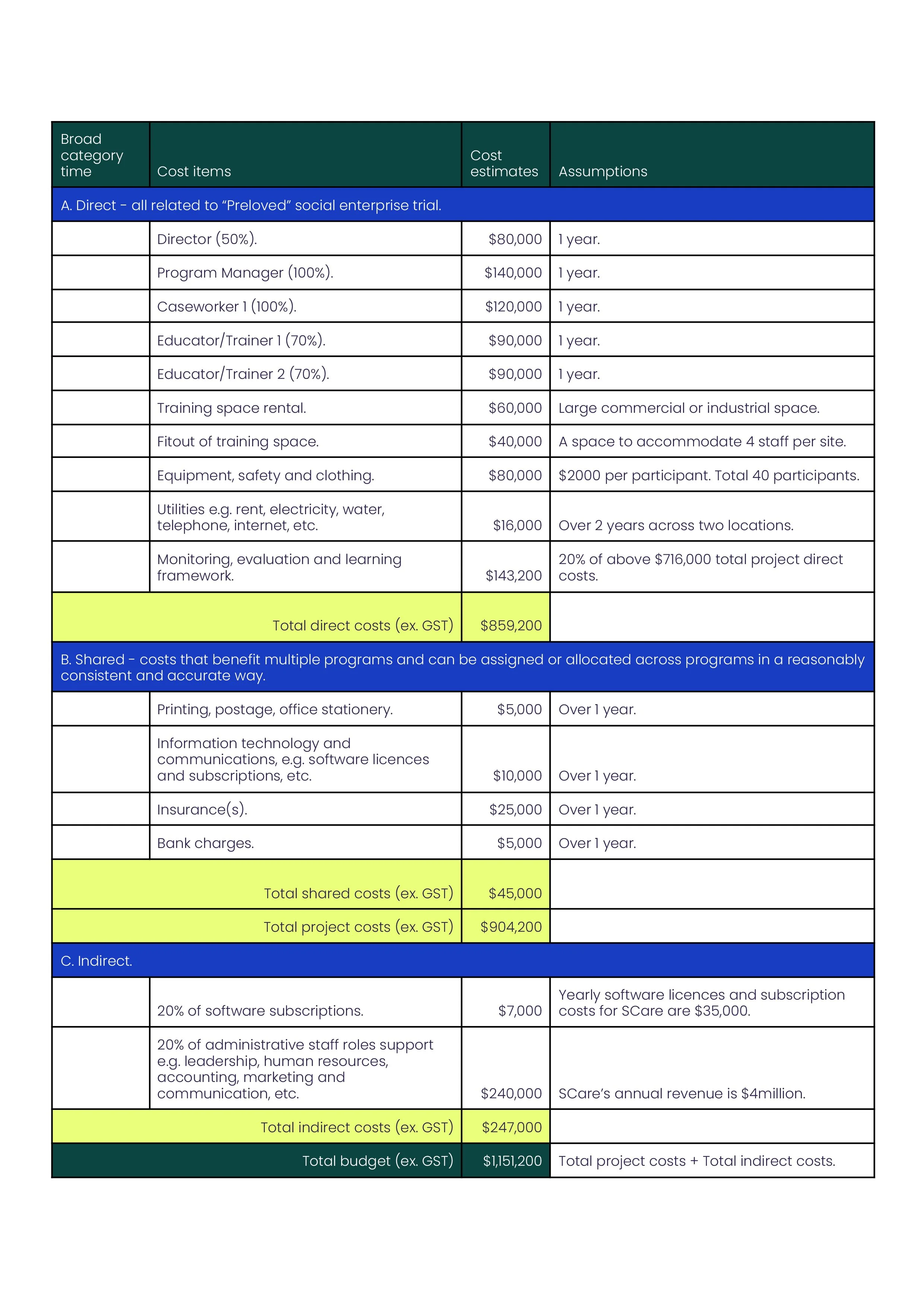 We present three illustrative scenarios below, drawn from programs that may or may not currently operate in Australia. These examples aim to assist both for-purpose organisations and funders in understanding various approaches to budgeting for direct, shared, and indirect costs according to their specific needs and contexts.
