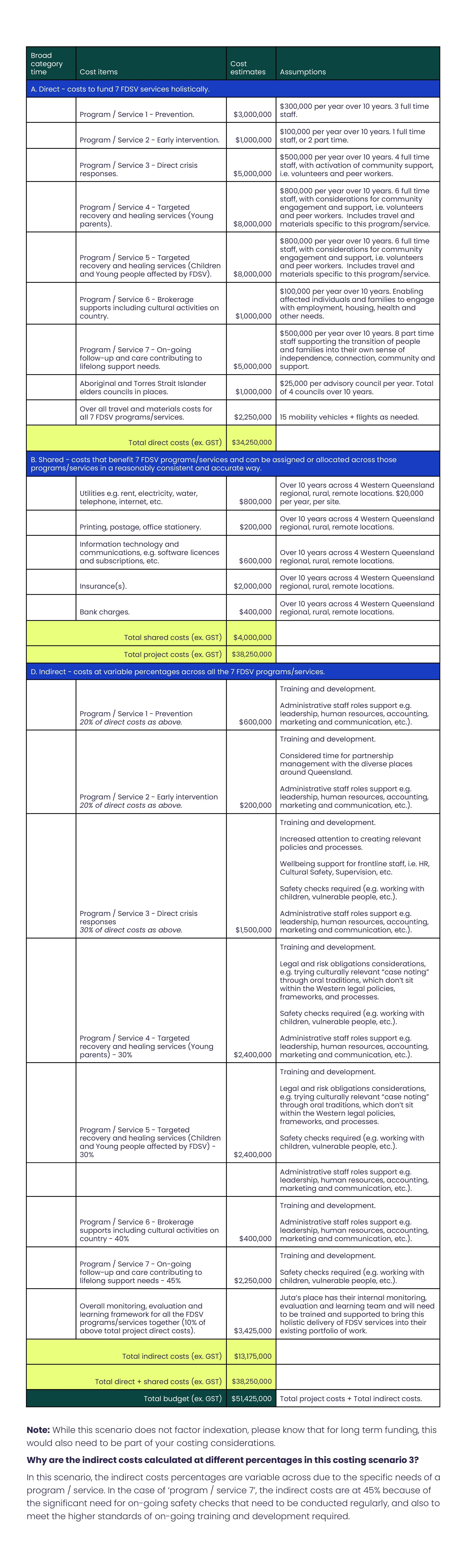 This scenario applies variable rates for indirect costs across seven programs and services. It shows the complex budgeting required by an Aboriginal and Torres Strait Islander community-controlled organisation in regional, rural, and remote Queensland, aiming to address holistic and long-term needs.